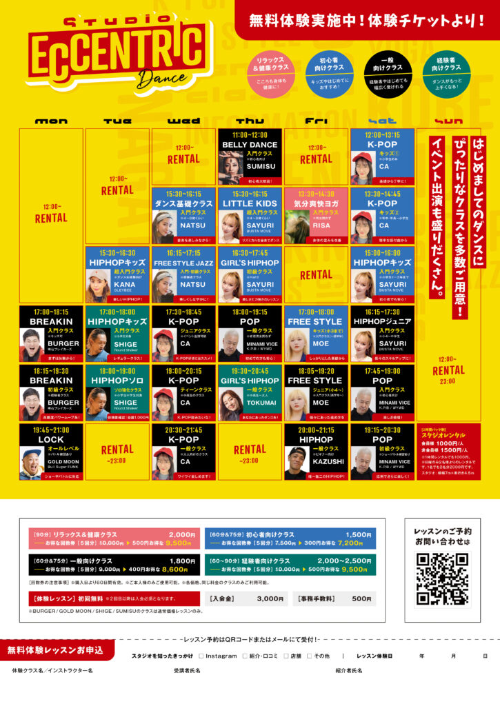 2時間レンタル(レンタルは1時間でも1,000円です。)会員様 2時間1,000 *日曜日は2名~(1名でのご利用は2,000円) ※表記は会員価格 非会員さまは2h1,500円 只今、スケジュール修正中 ※レンタルは曜日時間の合間でのご利用が可能ですので一度ご確認ください できるだけ対応致します。